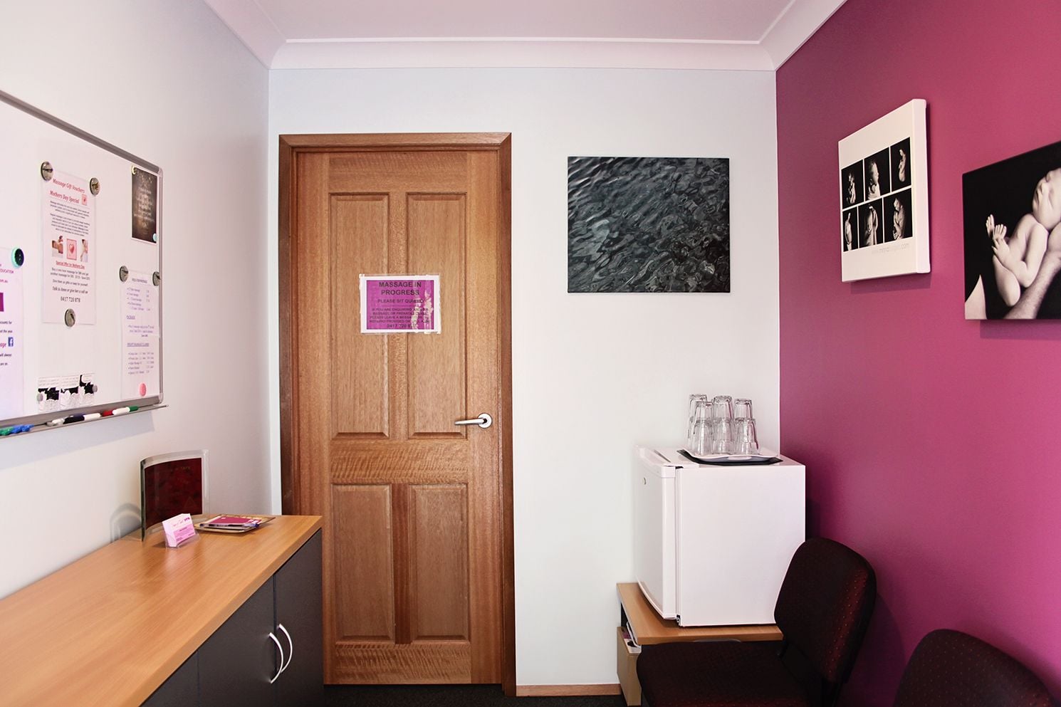 | The adjoining bathroom is stunning. A lovely area to prepare for your massage and get dressed again afterwards. | Warm, inviting and relaxing. Perfect for your next massage. | By moving the massage table, the room easily transforms from a massage room, to a comfortable open space for my prenatal classes. |